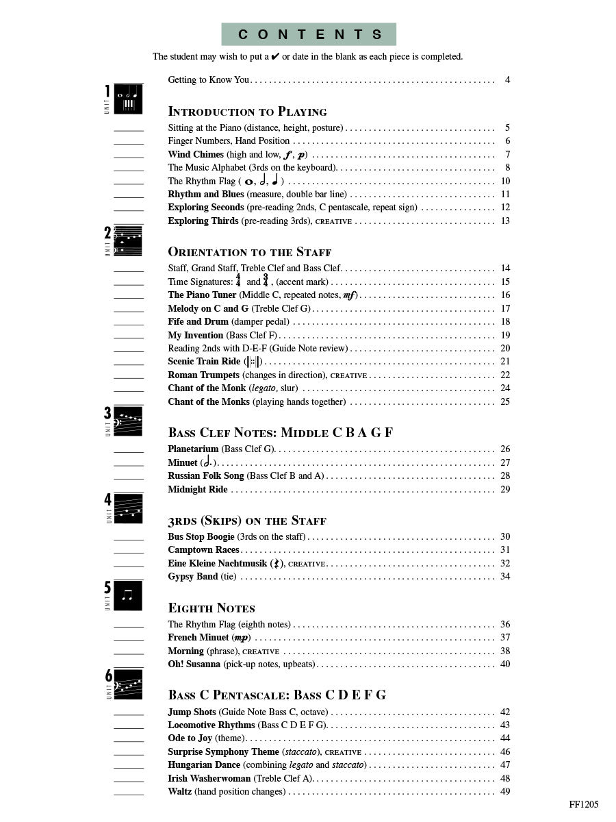 Book 1 covers fundamental rhythms, all the notes of the grand staff, C position, G position. Contents include: Aloha Oe • Amazing Grace • Bagpipes • Bus Stop Boogie • Camptown Races • Chant of the Monk • Chant of the Monks • Chinese Dragon • Chord Crossings • Dreamscape • Eine Kleine Nachtmusik • English Minuet • Fife and Drums • Forest Drums • French Minuet.