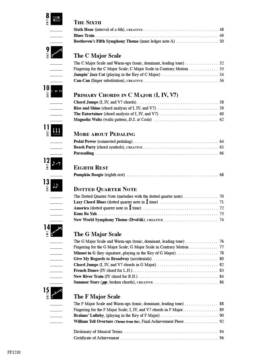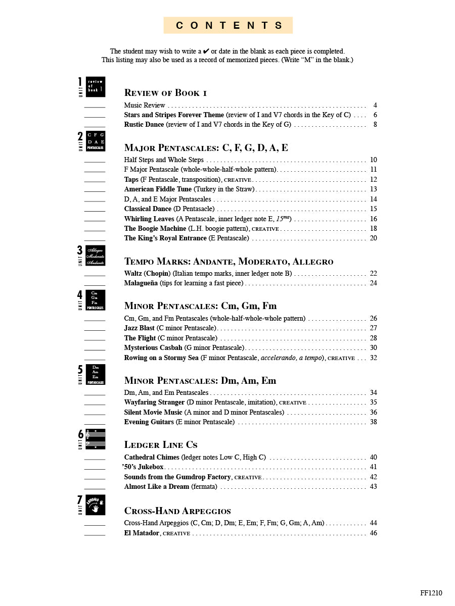 Major and minor pentascales; intervals through the 6th; C. G, and F major scales. Contents include: Almost Like a Dream • America • American Fiddle Tune • Beach Party • Beethoven's Fifth Symphony Theme • Blues Train • The Boogie Machine • Brahms' Lullaby • Can-Can • Cathedral Chimes • Chord Jumps • Classical Dance • Cross-Hand Arpeggios • El Matado.