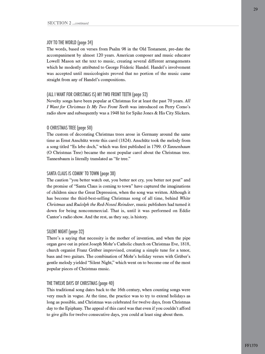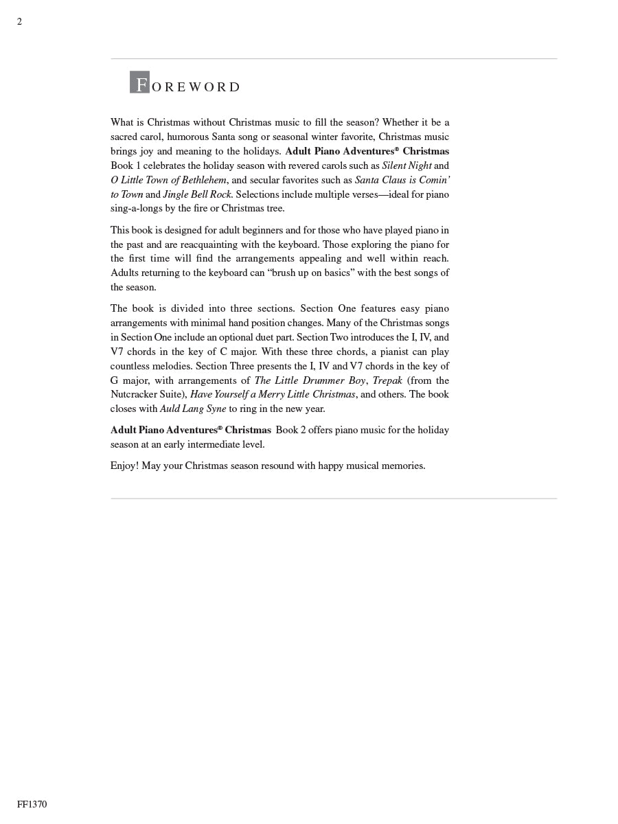 Through sacred carols, humorous Santa songs, and winter favorites, adult beginners and those reacquainting with the keyboard can celebrate with the best songs of the season. Adult Piano Adventures Christmas Book 1 features three sections: Beginning Christmas Songs, Christmas Songs in the Key of C major, and Christmas Songs in the key of G major. Contents include: We Wish You a Merry Christmas • Angels We Have Heard on High • Away in a Manger • Jingle Bells • We Three Kings of Orient Are • (There's No Place Like) Home for the Holidays • It Came Upon the Midnight Clear • O Little Town of Bethlehem • Frosty the Snowman • Jingle-Bell Rock • I'll Be Home for Christmas • Little Drummer Boy • Have Yourself a Merry Little Christmas • and more. Online access to audio recordings of the piano selections is included, as well as orchestrated accompaniments for play-along fun. [playlist artists="false" images="false" ids="3167,3169,3170,3172"]