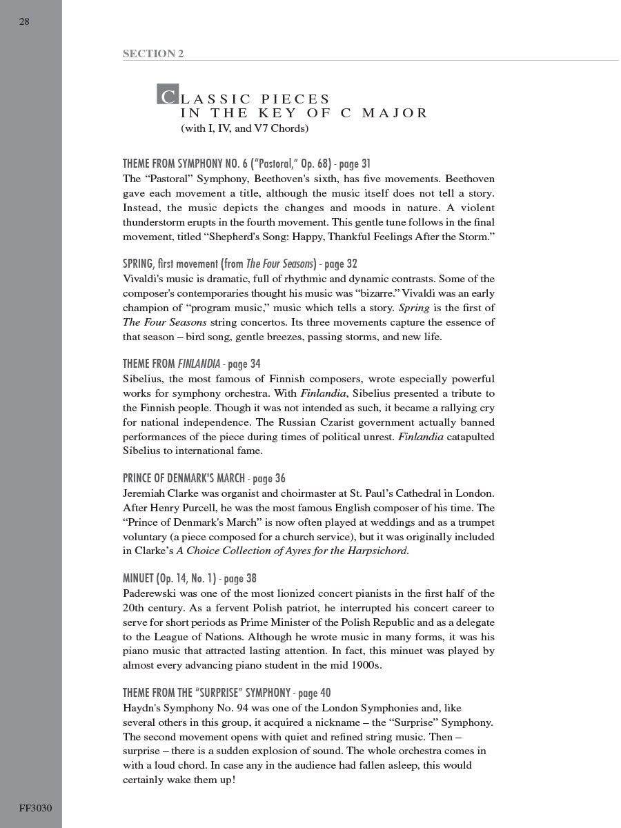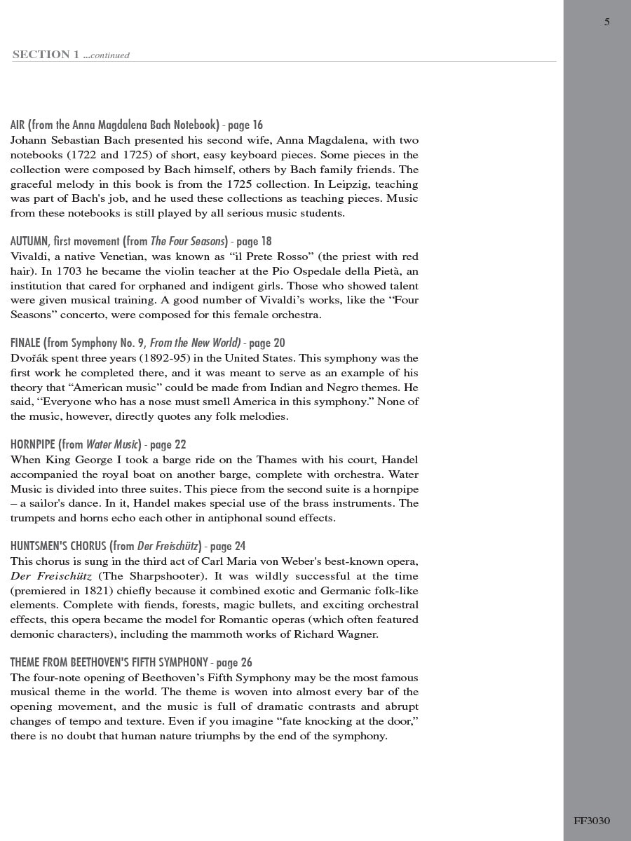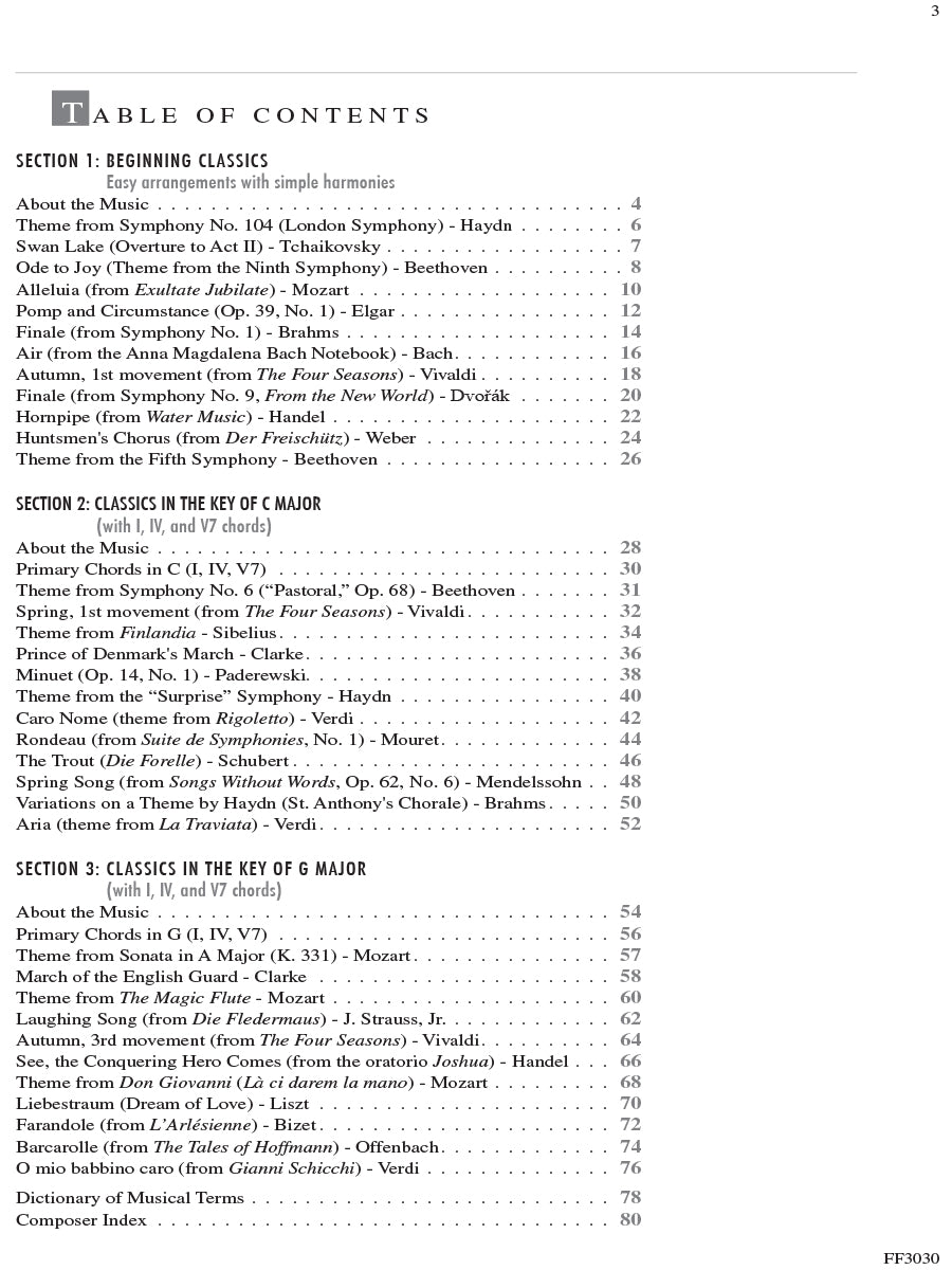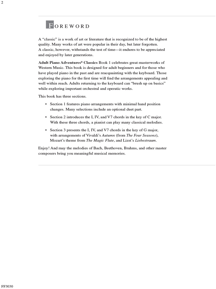 Adult Piano Adventures Classics Book 1 celebrates great masterworks of Western Music, including symphony themes, opera gems, and classical favorites. The melodies of Bach, Beethoven, Brahms, and other master composers are arranged at just the right level for adult beginners and for those who are returning to the keyboard. Section 1 features piano arrangements with minimal hand position changes, and many selections include an optional duet part. Section 2 introduces the I, IV, and V7 chords in the key of C major, harmonizing themes such as Sibelius's Finlandia, Schubert's The Trout, and Mendelssohn's Spring Song. Section 3 presents the primary chords in the key of G major, with arrangements of Vivaldi’s Autumn (from The Four Seasons), Mozart’s theme from The Magic Flute, Lizst’s Liebestraum, and more.