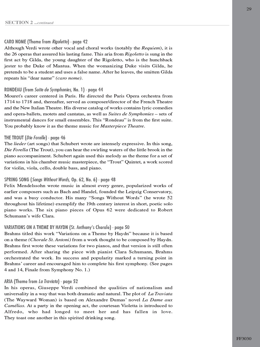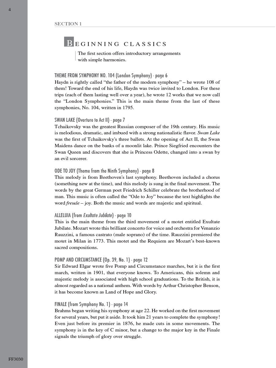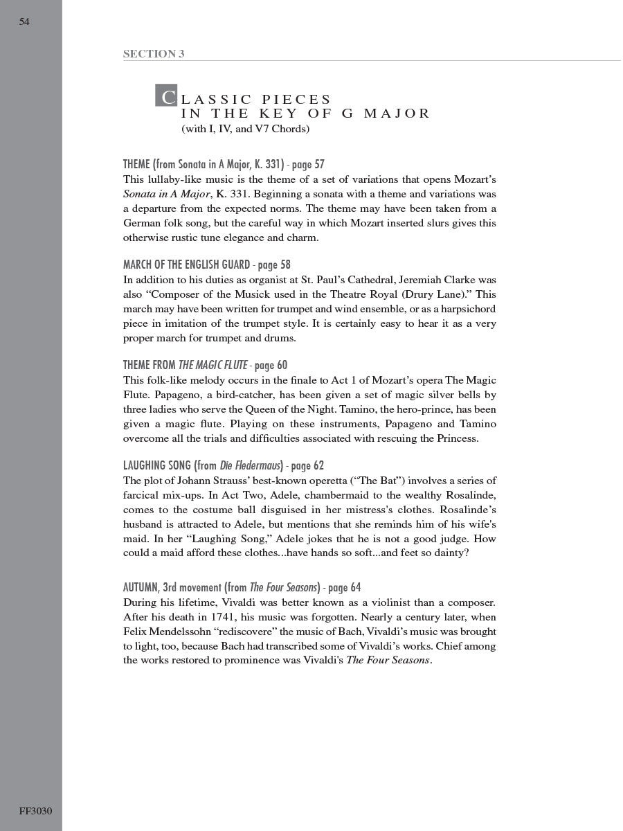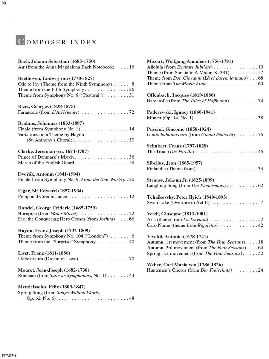 Adult Piano Adventures Classics Book 1 celebrates great masterworks of Western Music, including symphony themes, opera gems, and classical favorites. The melodies of Bach, Beethoven, Brahms, and other master composers are arranged at just the right level for adult beginners and for those who are returning to the keyboard. Section 1 features piano arrangements with minimal hand position changes, and many selections include an optional duet part. Section 2 introduces the I, IV, and V7 chords in the key of C major, harmonizing themes such as Sibelius's Finlandia, Schubert's The Trout, and Mendelssohn's Spring Song. Section 3 presents the primary chords in the key of G major, with arrangements of Vivaldi’s Autumn (from The Four Seasons), Mozart’s theme from The Magic Flute, Lizst’s Liebestraum, and more.