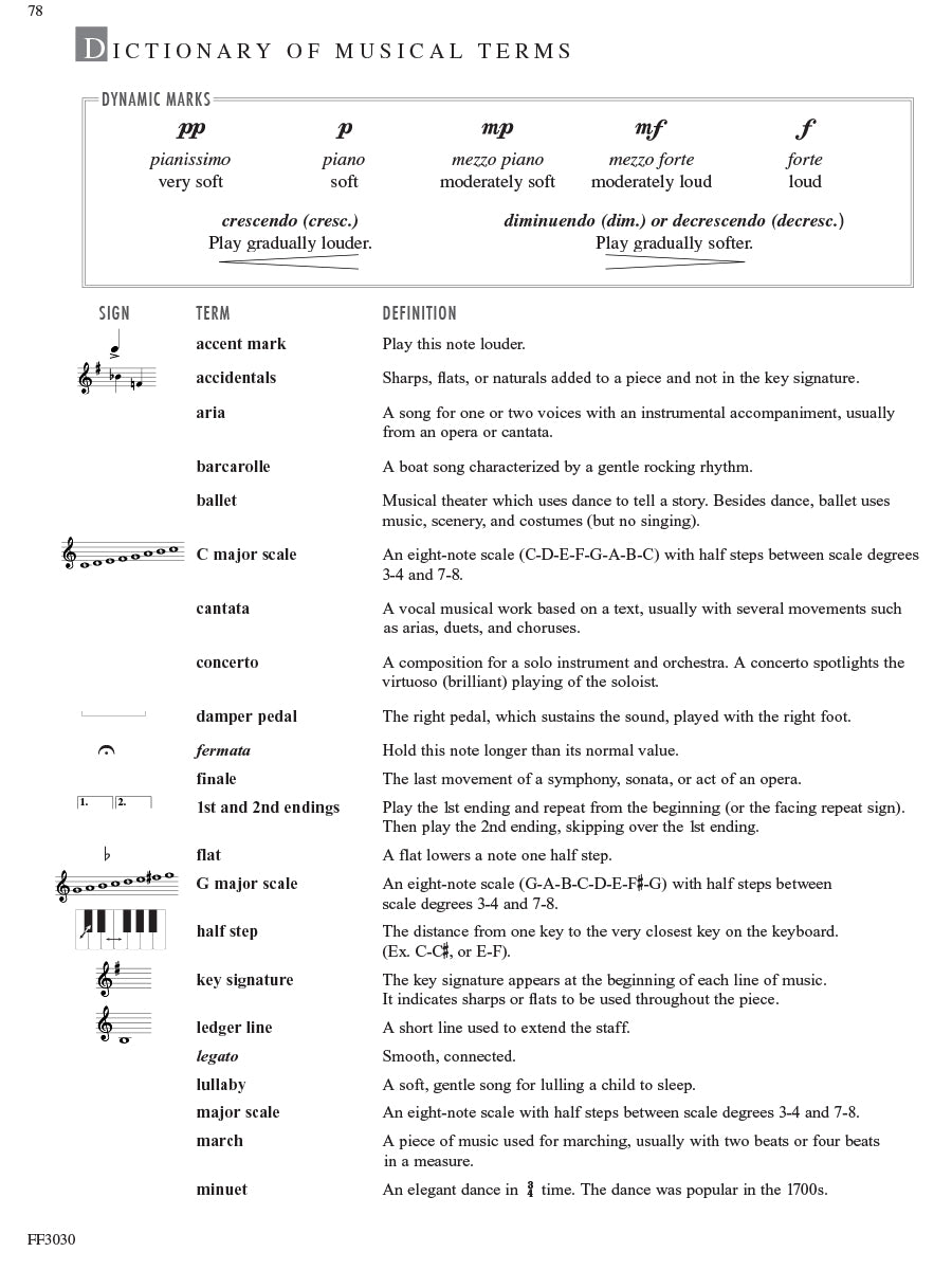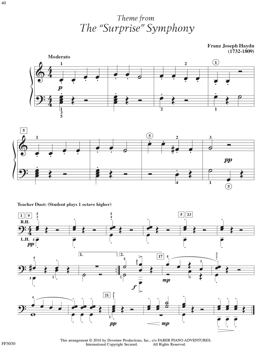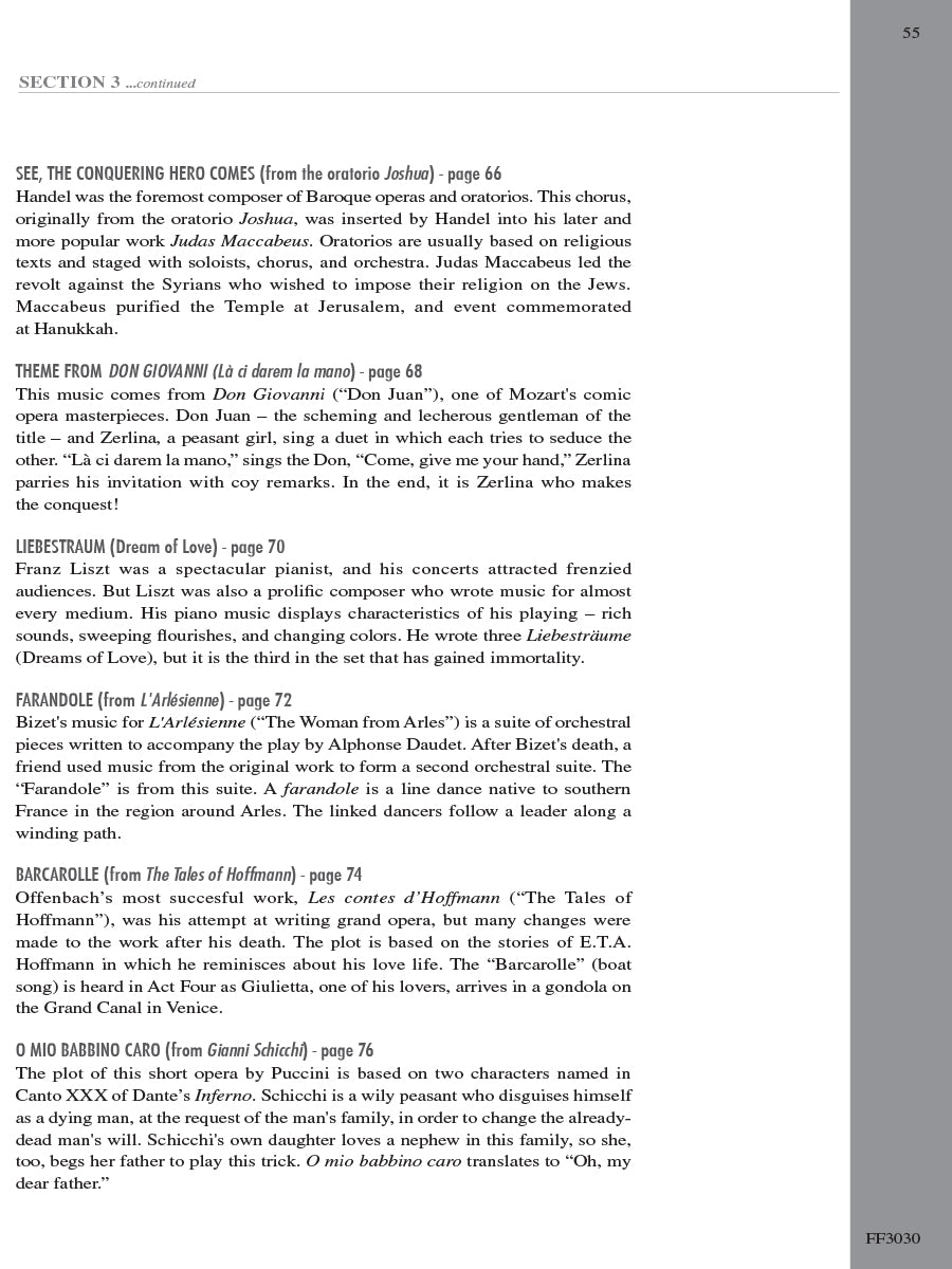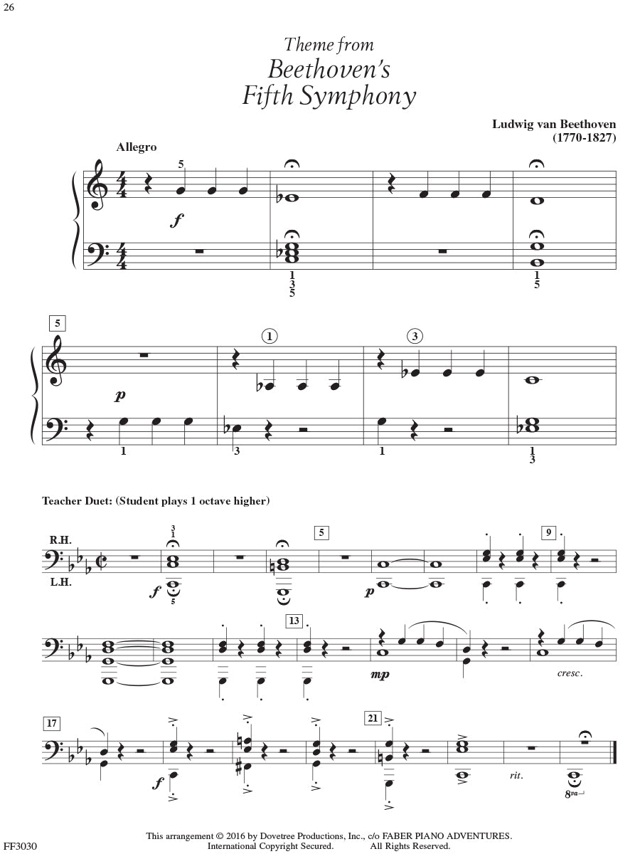 Adult Piano Adventures Classics Book 1 celebrates great masterworks of Western Music, including symphony themes, opera gems, and classical favorites. The melodies of Bach, Beethoven, Brahms, and other master composers are arranged at just the right level for adult beginners and for those who are returning to the keyboard. Section 1 features piano arrangements with minimal hand position changes, and many selections include an optional duet part. Section 2 introduces the I, IV, and V7 chords in the key of C major, harmonizing themes such as Sibelius's Finlandia, Schubert's The Trout, and Mendelssohn's Spring Song. Section 3 presents the primary chords in the key of G major, with arrangements of Vivaldi’s Autumn (from The Four Seasons), Mozart’s theme from The Magic Flute, Lizst’s Liebestraum, and more.