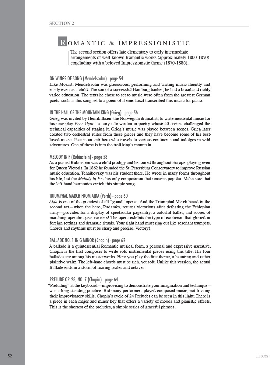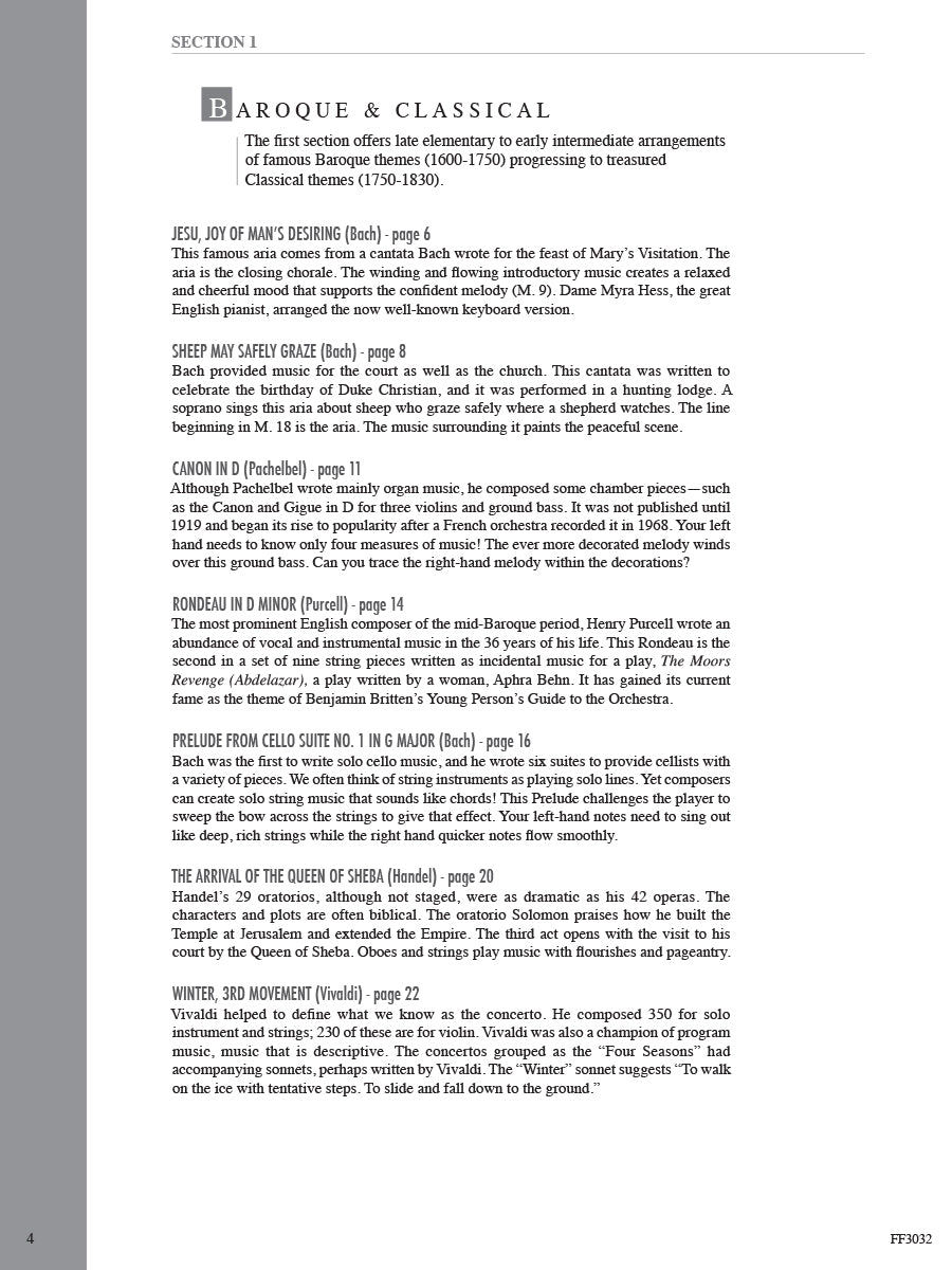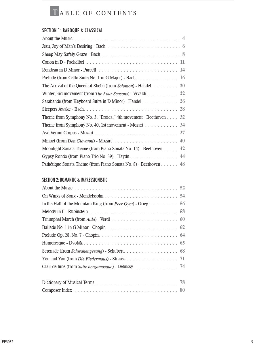 In this inspiring collection, late-elementary to early-intermediate pianists will find appealing arrangements that advance skills while exploring masterworks of Western music. The famous orchestral, keyboard, and operatic repertoire here spans four periods of music history. In the Baroque & Classical section, discover the elegance of Bach, the beauty of Mozart, and the passion of Beethoven. Through the pages of the Romantic & Impressionistic section, sample the lyricism of Chopin, the drama of Grieg, and the atmosphere of Debussy. May the melodies of these and many other composers open an enduring world of expression and sound.