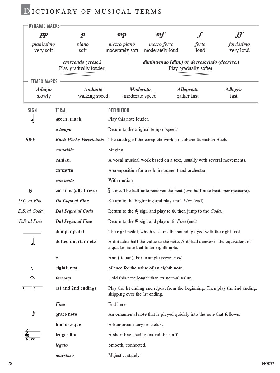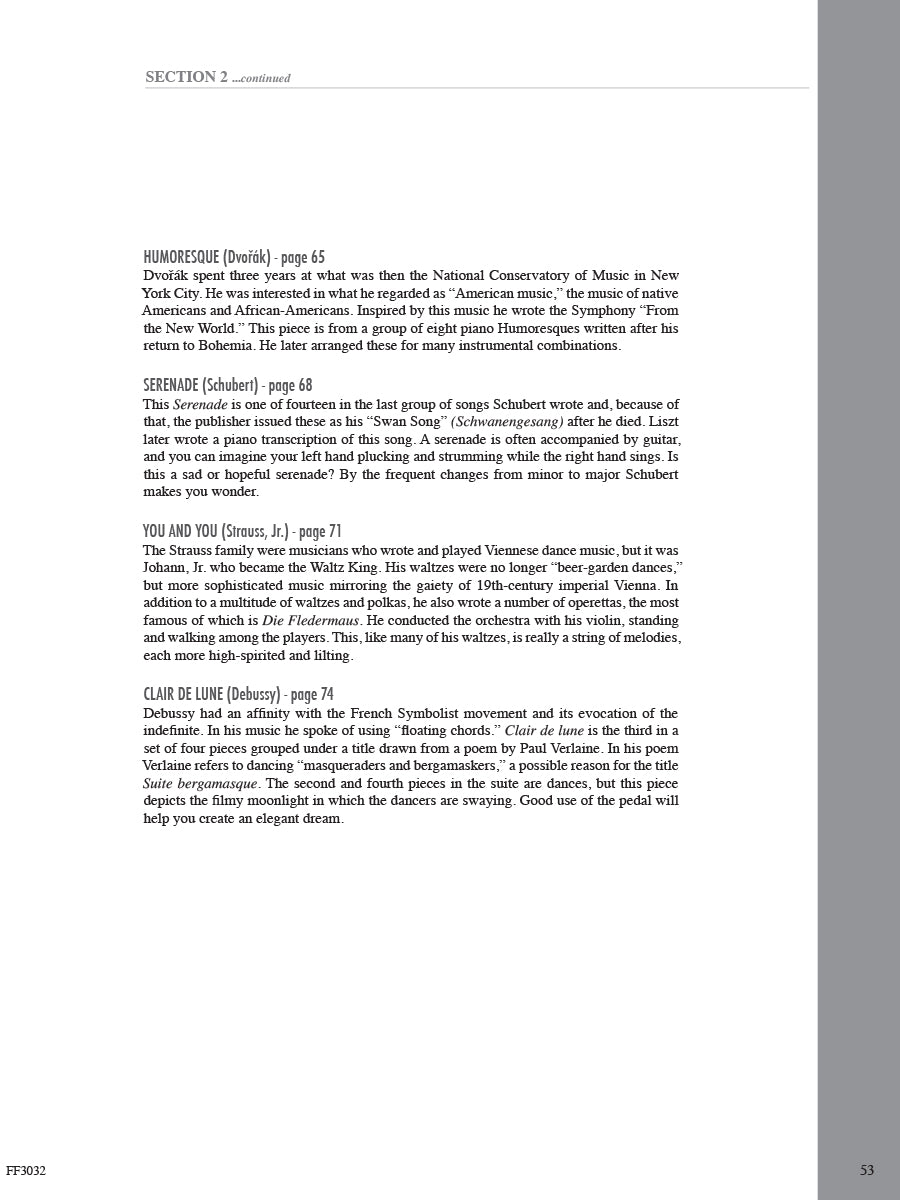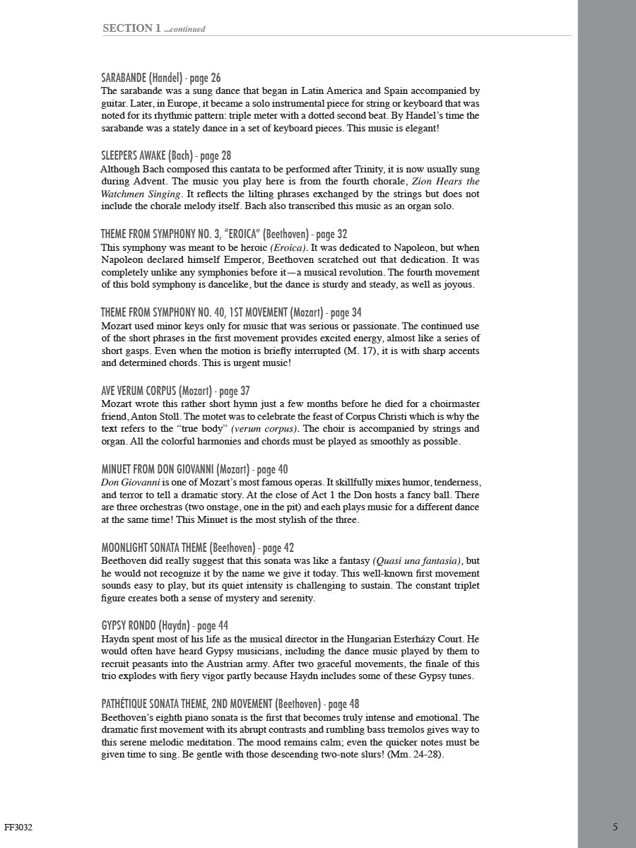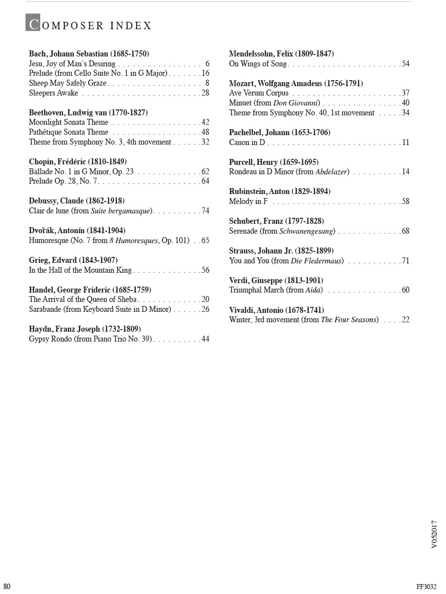In this inspiring collection, late-elementary to early-intermediate pianists will find appealing arrangements that advance skills while exploring masterworks of Western music. The famous orchestral, keyboard, and operatic repertoire here spans four periods of music history. In the Baroque & Classical section, discover the elegance of Bach, the beauty of Mozart, and the passion of Beethoven. Through the pages of the Romantic & Impressionistic section, sample the lyricism of Chopin, the drama of Grieg, and the atmosphere of Debussy. May the melodies of these and many other composers open an enduring world of expression and sound.
