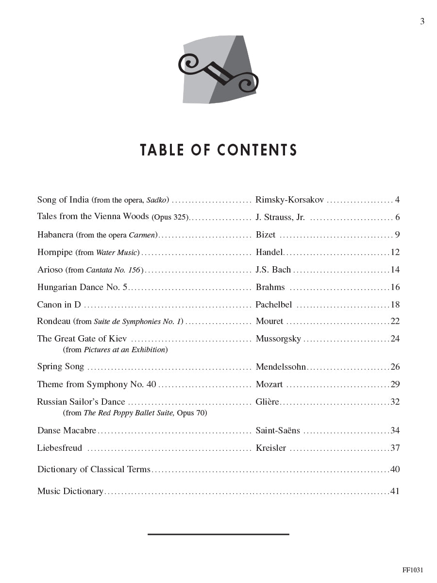 This book is a treasury of the most popular and most requested masterworks of Western music. The selections are taken from original non-keyboard sources and arranged to create a “big” sound while remaining within the intermediate level. Contents include: Arioso (from Cantata No. 156) by J.S. Bach • Canon in D by Pachelbel • Danse Macabre by Saint-Saëns • The Great Gate of Kiev (from Pictures at an Exhibition) by Mussorgsky • Habanera (from the opera Carmen) by Bizet • Hornpipe (from Water Music) by Handel • Hungarian Dance No. 5 by Brahms • Liebesfreud by Kreisler • Rondeau (from Suite de Symphonies No. 1) by Mouret • Russian Sailor's Dance (from the opera Sadko) by Rimsky-Korsakov • Spring Song by Mendelssohn • Tales from the Vienna Woods (Opus 325) by J. Strauss, Jr. • Theme from Symphony No. 40 by Mozart.