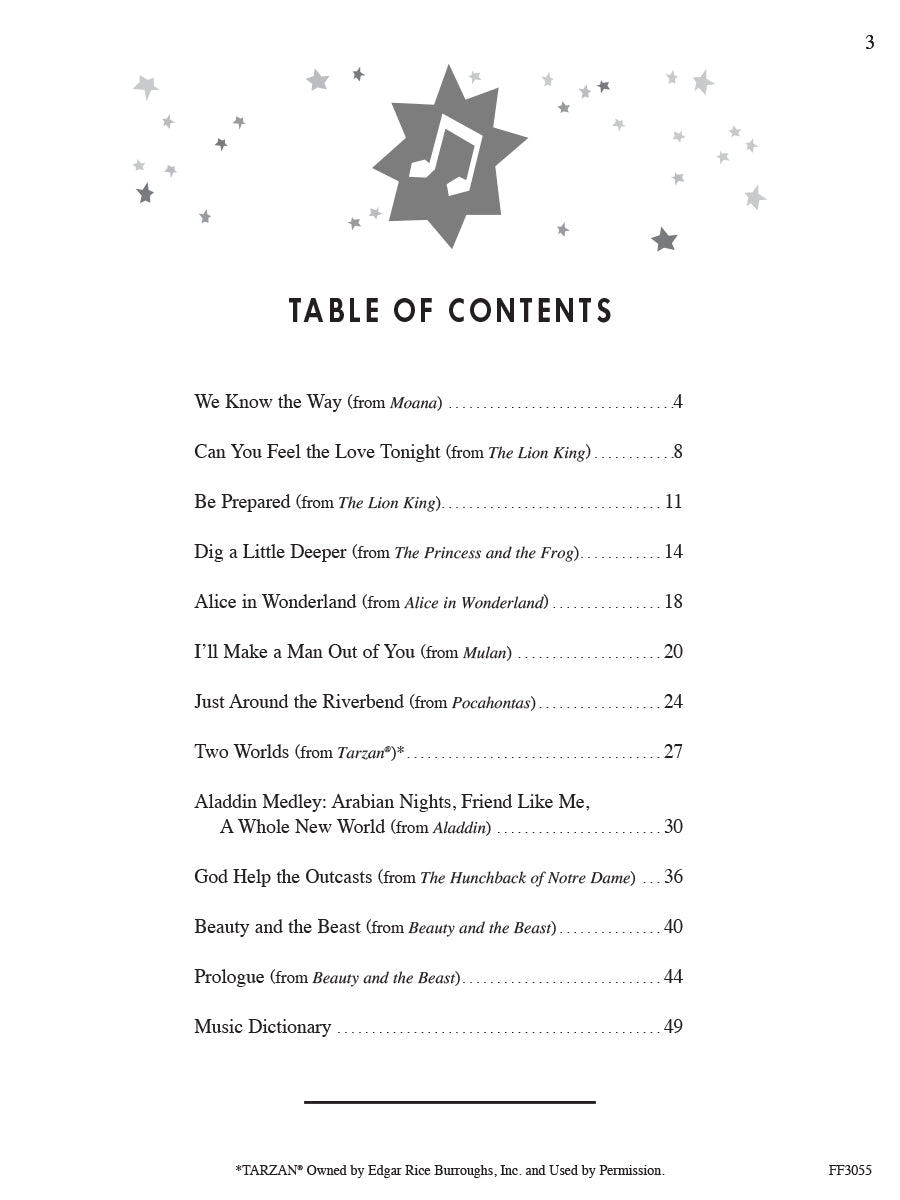 BigTime Piano Disney is a celebration of contemporary and classic Disney songs arranged for the Level 4 pianist and beyond. Intermediate students can enjoy big-sounding pieces from Aladdin, The Hunchback of Notre Dame, Moana, and more. Songs include: Aladdin Medley (Arabian Nights, Friend Like Me, A Whole New World) (Aladdin) • Alice in Wonderland (Alice in Wonderland) • Be Prepared (The Lion King) • Beauty and the Beast (Beauty and the Beast) • Can You Feel the Love Tonight (The Lion King) • Dig a Little Deeper (The Princess and the Frog) • God Help the Outcasts (The Hunchback of Notre Dame) • I’ll Make a Man Out of You (Mulan) • Just Around the Riverbend (Pocahontas) • Prologue (Beauty and the Beast) • Two Worlds (Tarzan®) • We Know the Way (Moana)