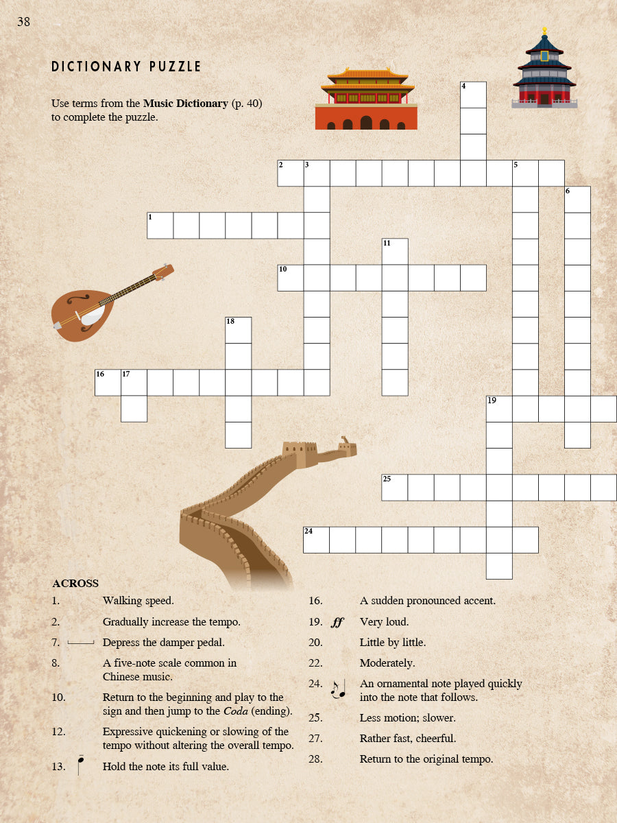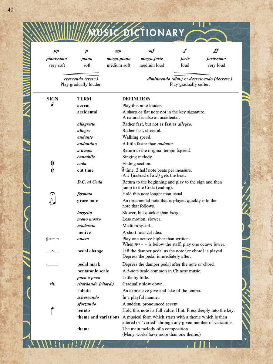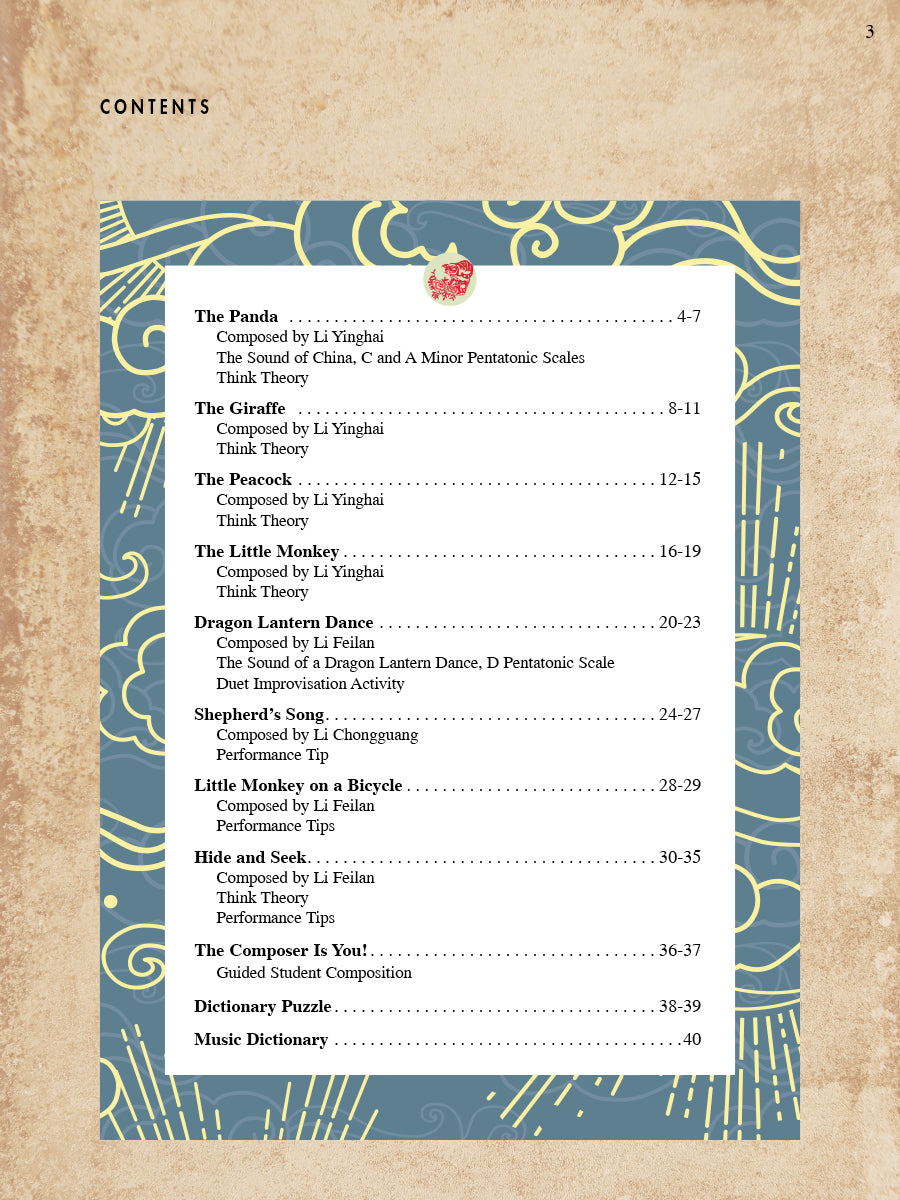 BigTime Piano Music from China is a striking selection of original Chinese compositions perfect for intermediate students (Level 4 and above). Thematically, the music explores a veritable zoo of animals from the real-life panda to the mythical dragon, in addition to traveling the rolling hills of a shepherd and playing a lighthearted game of hide and seek. Colorful introductory notes, vital performance tips, and analytical theory questions aid the student’s musical journey, while duet improvisations and a composition exercise provide creative play. Songs include: Dragon Lantern Dance • The Giraffe • Hide and Seek • The Little Monkey • Little Monkey on a Bicycle • The Panda • The Peacock • Shepherd’s Song