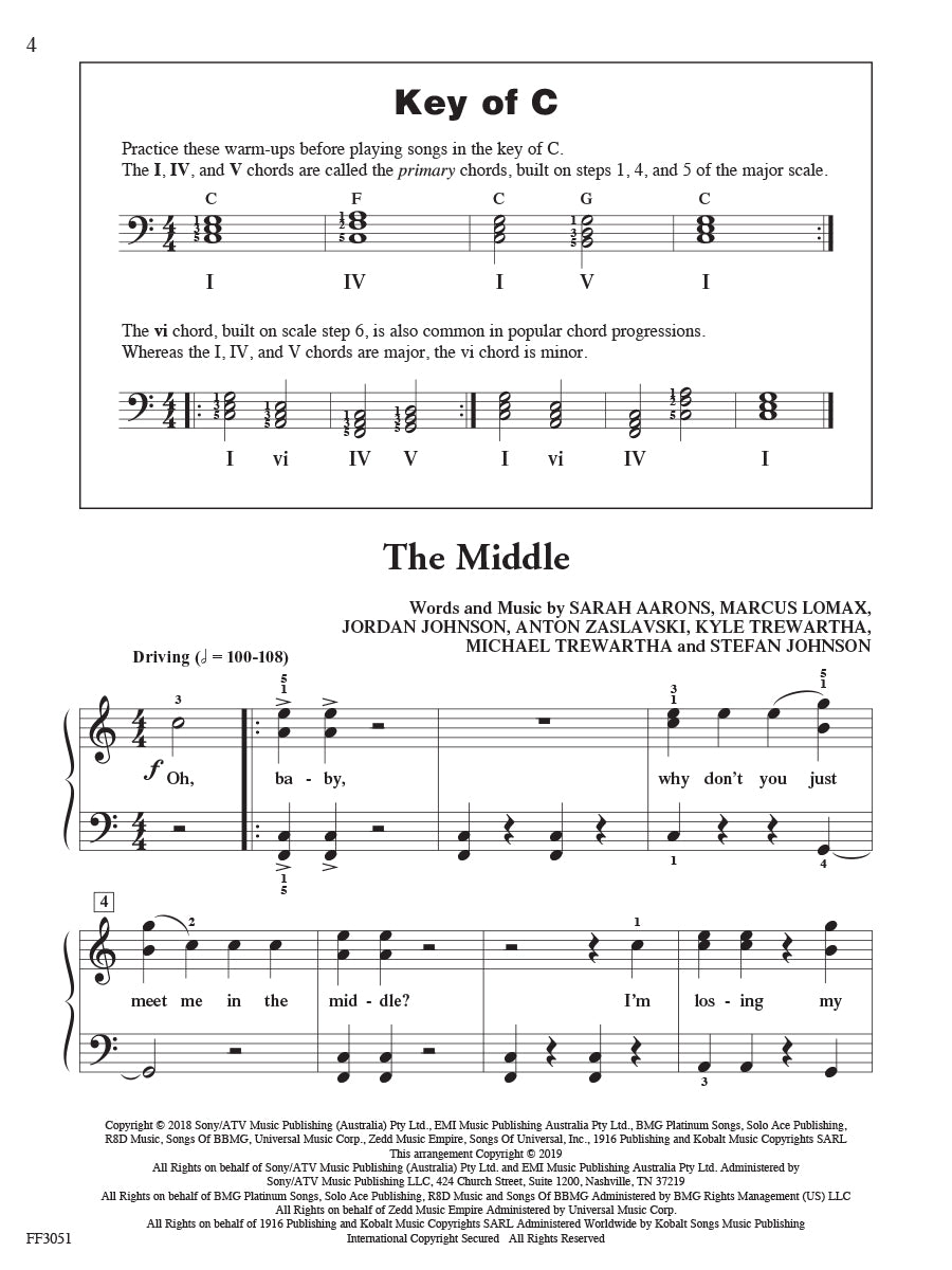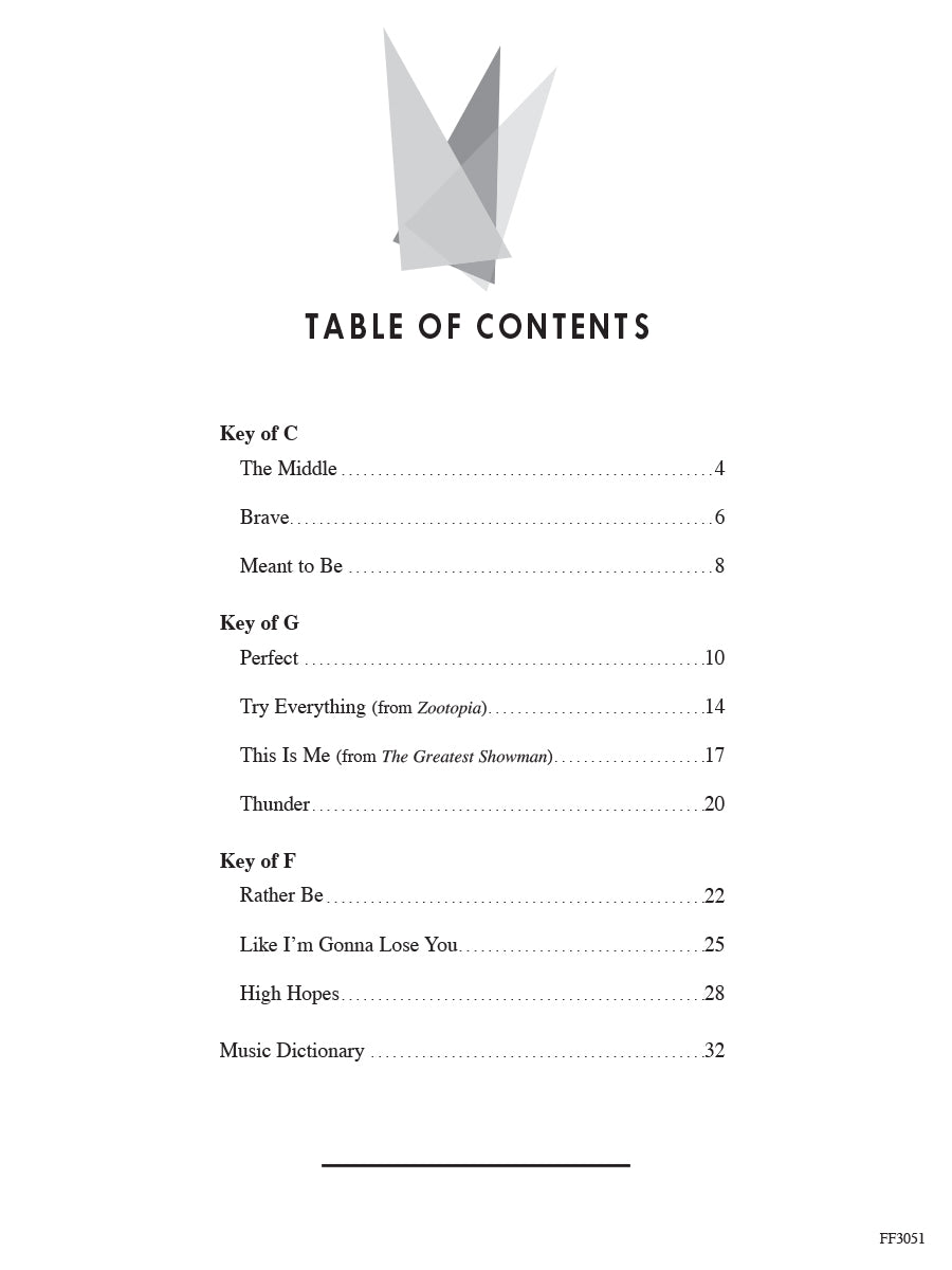 Enjoy 10 outstanding arrangements of popular hits by today's leading artists such as Ed Sheeran, Meghan Trainor, Imagine Dragons, and more. In keeping with the "ChordTime" concept, this collection motivates the Level 2B student to learn the building block harmonies of current pop music: the I, IV, V, and vi chords. Songs include: Brave (Sara Bareilles) • High Hopes (Panic! At The Disco) • Like I’m Gonna Lose You (Meghan Trainor feat. John Legend) • Meant to Be (Bebe Rexha feat. Florida Georgia Line) • The Middle (Zedd, Maren Morris & Grey) • Perfect (Ed Sheeran) • Rather Be (Clean Bandit feat. Jess Glynne) • This Is Me (from The Greatest Showman) • Thunder (Imagine Dragons) • Try Everything (Shakira, from Zootopia)