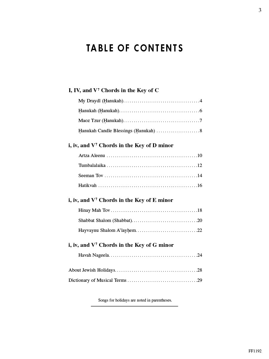 This collection of favorite Hebrew and Yiddish folk songs and traditional melodies is arranged especially for the Level 2B pianist. Offers motivational songs for Jewish holidays celebrated throughout the year. Selections include: My Draydl • Hanukah • Maoz Tzur • Hanukah Cradle Blessings • Artza Aleenu • Tumbalalaika • Seeman Tov • Hatikvah • Hinay Mah Tov • Shabbat Shalom • Hayvaynu Shalom A'layhem • Havah Nageela.