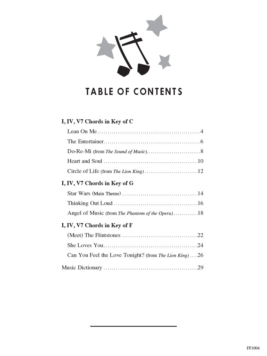 11 songs that include I-IV-V7 chords in the keys of C, G and F, featuring: Can You Feel the Love Tonight? • Do-Re-Mi • (Meet) The Flintstones • She Loves You • Star Wars • and more.
