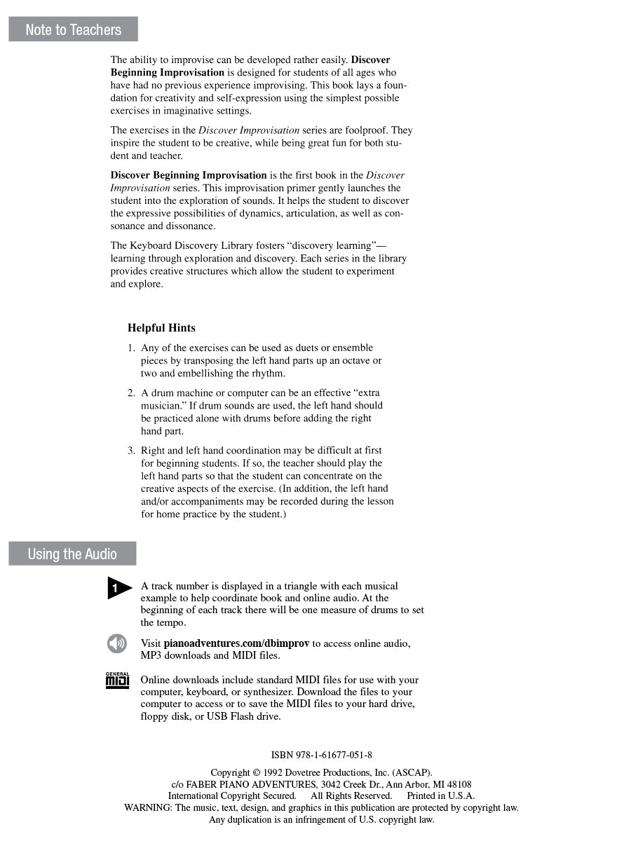 Designed for students of all ages who have had no previous experience improvising, this primer lays the foundation for composition and improvisation using the simplest possible exercises in imaginative settings. Features solo and duet improvisations, written assignments, theory review, and teacher accompaniments. Online access to background accompaniments is included for audio play-along.