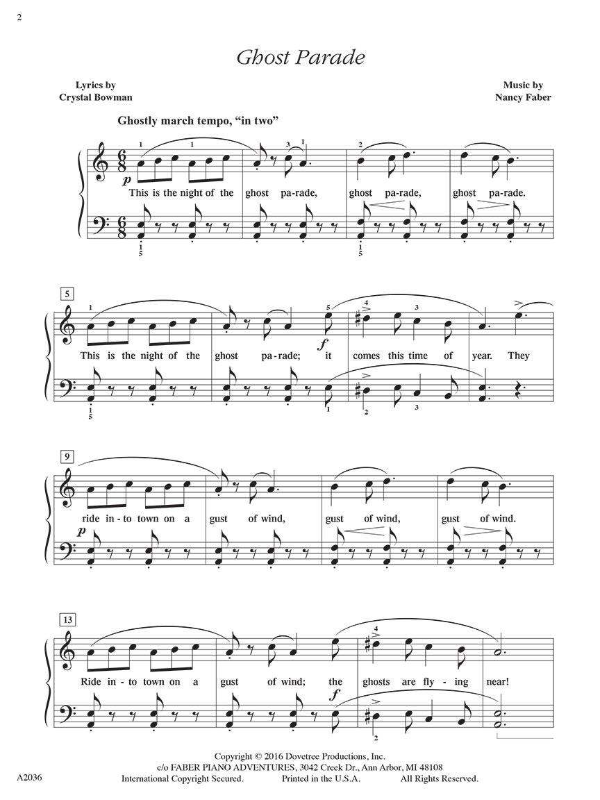 Don't be afraid of the ghost parade! This quick march in 6/8 time provides spooky fun in the key of A Minor. The whoosh of the wind will carry your students' hands from triad to triad over the full range of the keyboard. Also available for digital download on
