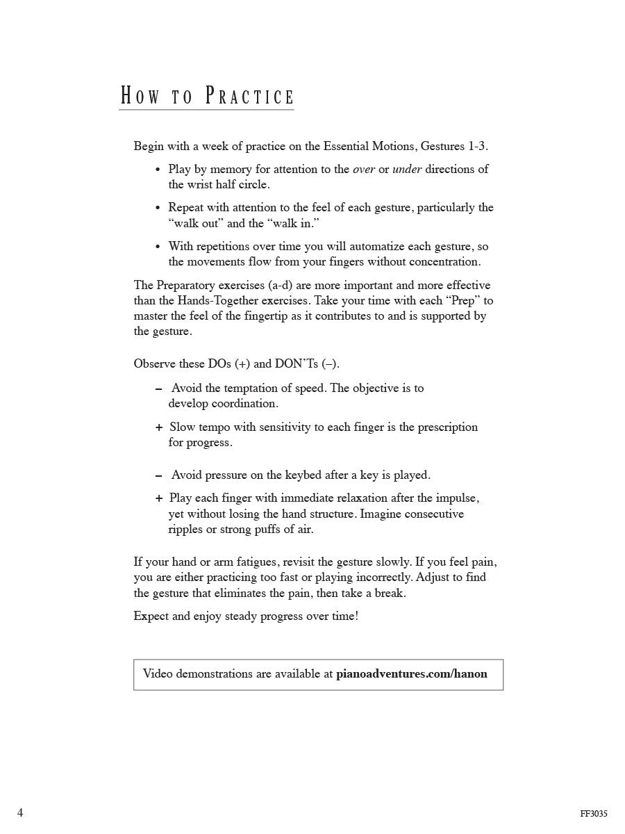 - Includes selected exercises from Hanon's The Virtuoso Pianist, Parts 1 and 2