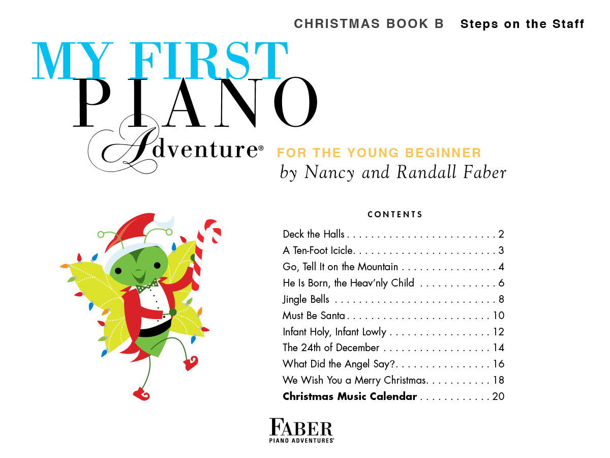 Join the My First Piano Adventure® “friends” as they play Christmas songs on the grand staff. Students celebrate with merry melodies such as “A Ten-Foot Icicle,” “Jingle Bells,” the hit song “Must Be Santa,” and carols from around the world. Songs include: A Ten-Foot Icicle • Deck the Halls • Go Tell It on the Mountain • He Is Born, the Heav'nly Child • Infant Holy, Infant Lowly • Jingle Bells • Must Be Santa • The 24th of December • What Did the Angel Say? • We Wish You a Merry Christmas.