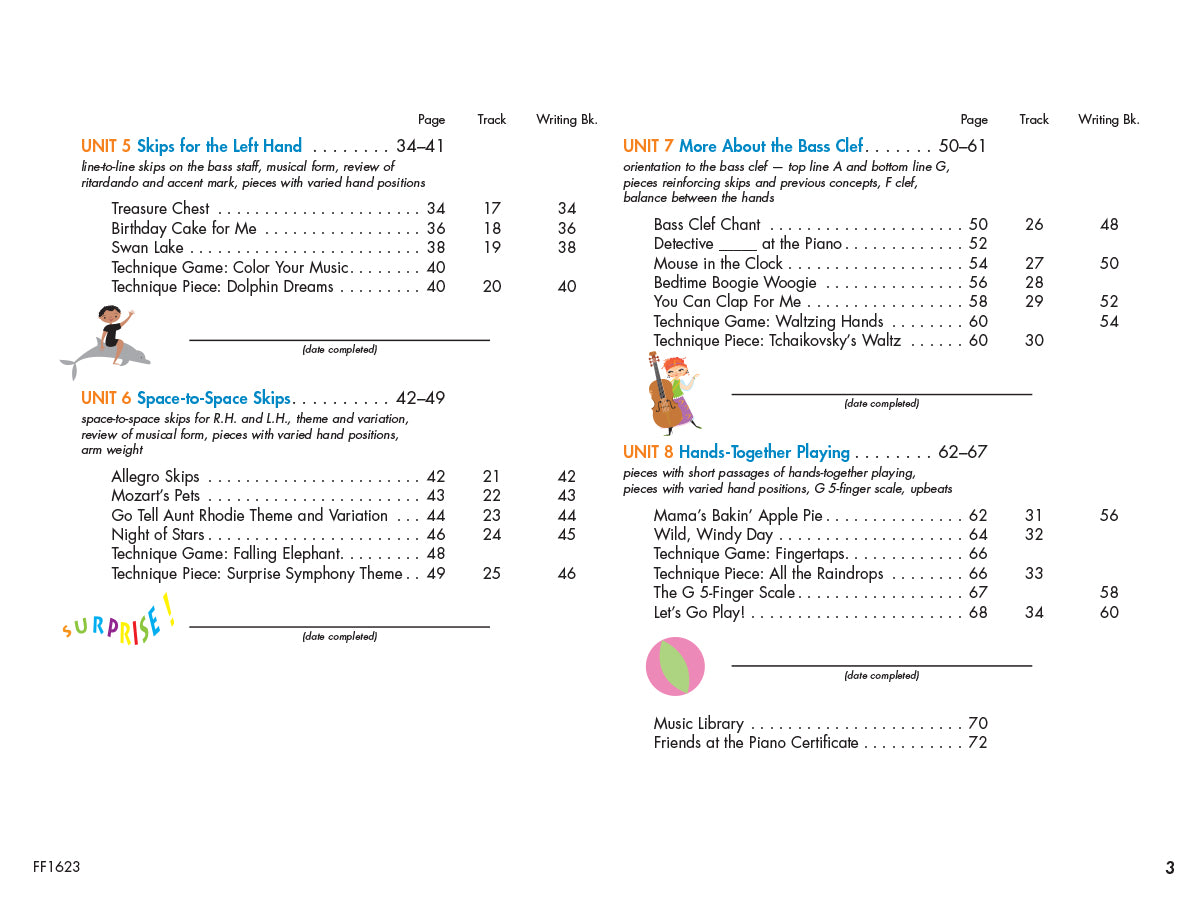 Book C of the Fabers' young beginner method continues the staff-reading adventure with the introduction of skips (3rds). Students first explore skips aurally and kinesthetically across the full range of the keyboard. A delightful variety of songs follow which carefully and comfortably guide the child toward line-line and space-space staff recognition.