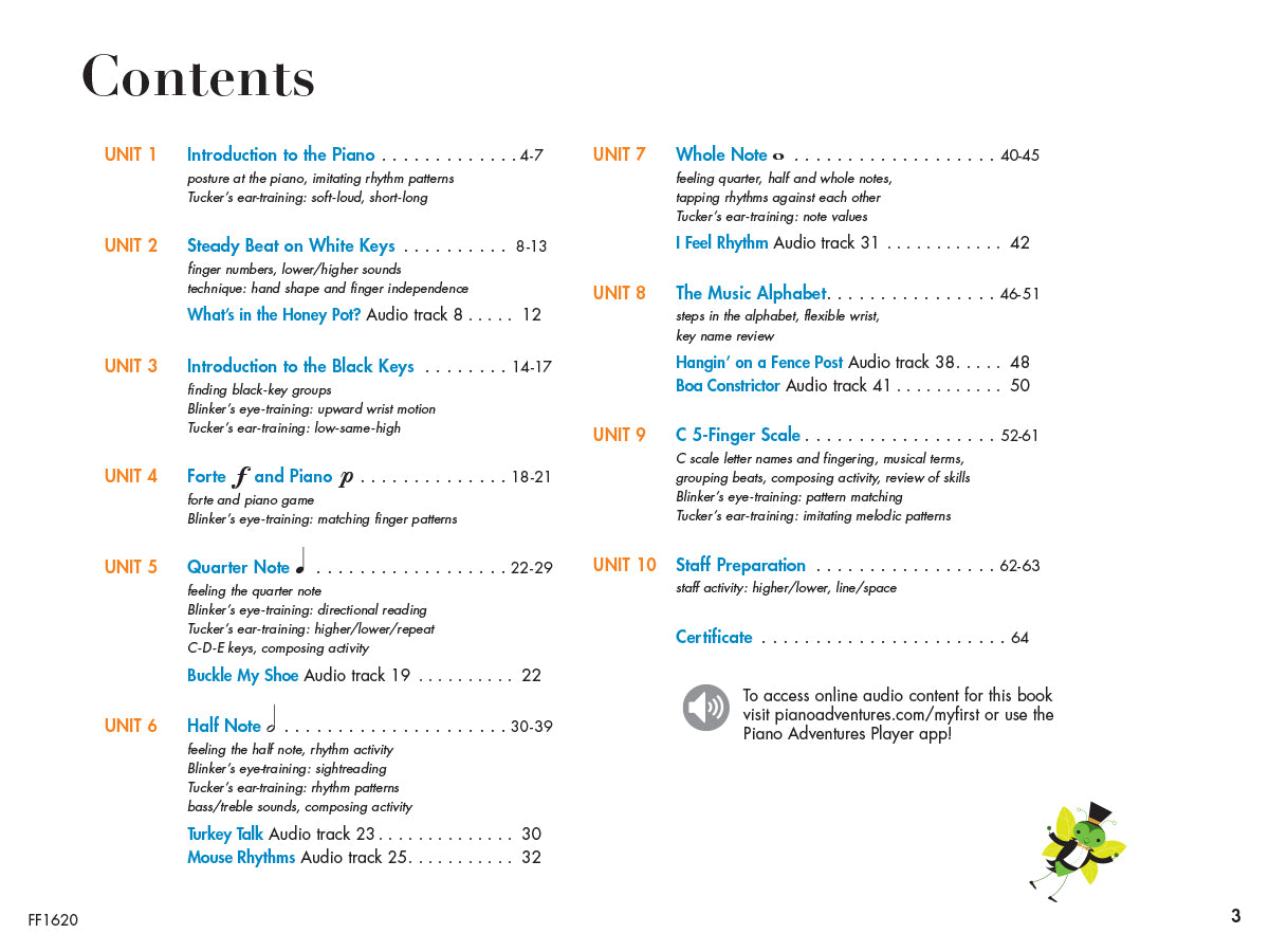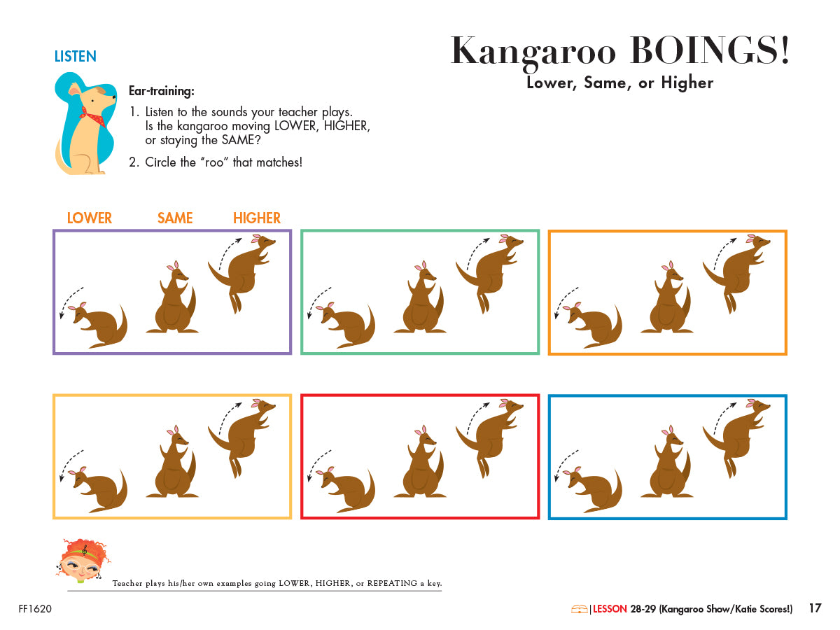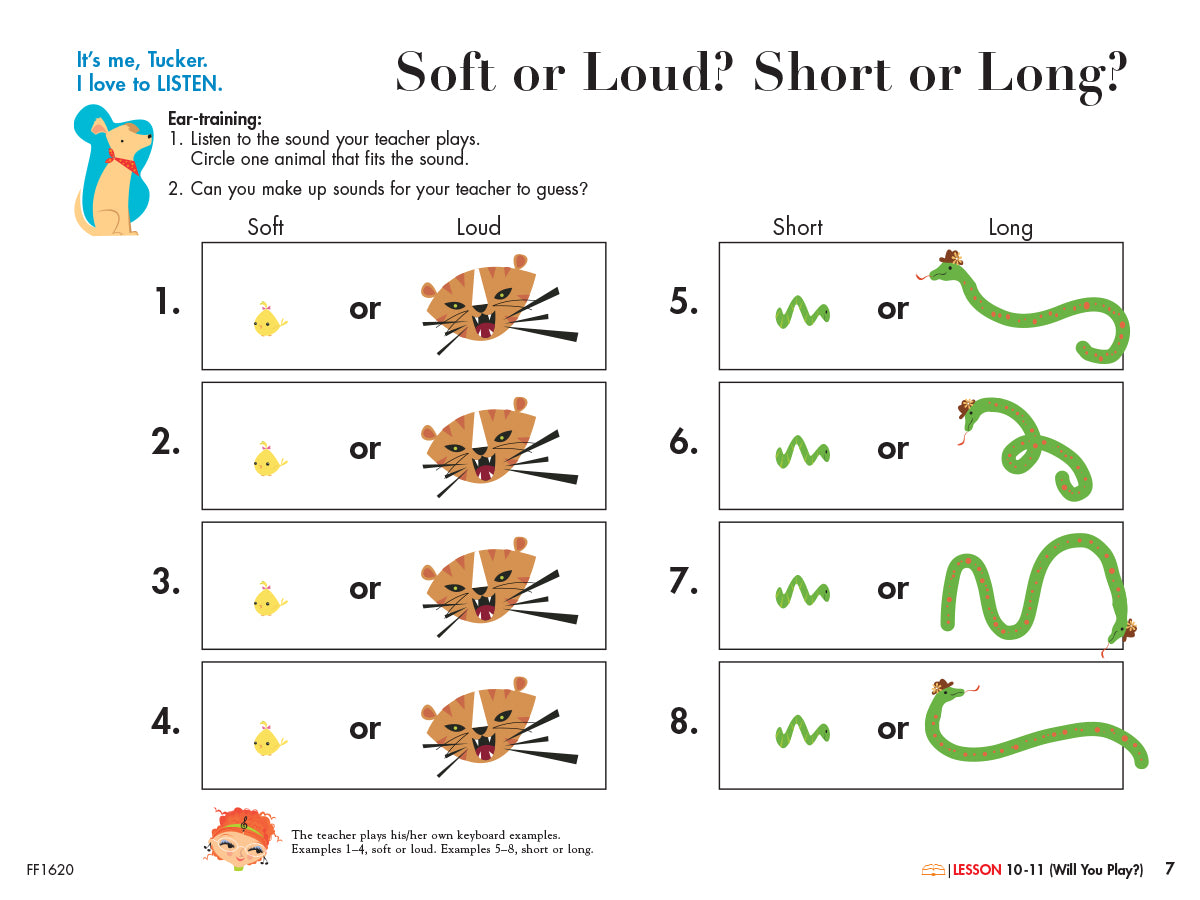Developing the ear and training the eye of the young child is a key component of the Writing Book A. Tucker, the mascot dog who loves to LISTEN, is always on the scene as the young child imitates, matches, and creates rhythmic and melodic patterns. The multi-cultural friends present improvisation and simple, guided composition activities. Blinker, the owl who loves to LOOK, helps students recognize patterns of rhythms and notes, and introduces sightreading. The Writing Book offers a holistic, musical approach to theory through discovery, creativity, imagination, and fun!