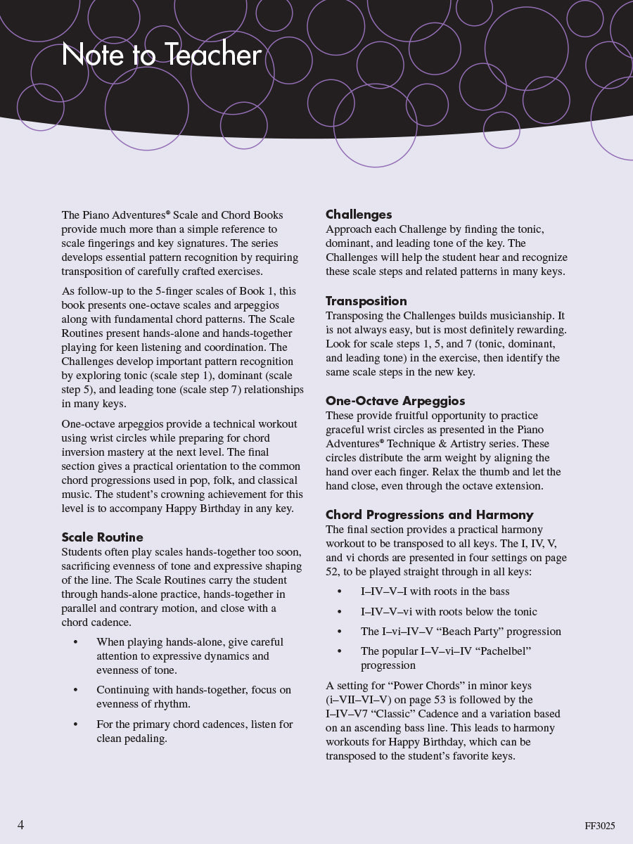 Intermediate students are ready to explore the challenges of one-octave scales and arpeggios. More than a simple reference to scale fingerings and key signatures, this book presents valuable patterns that engage the ear and give musical meaning to scale degrees. By transposing these patterns and common chord progressions, students gain deep understanding in all keys. With additional strategies for fluency and gesture, students are well-prepared for technical mastery. Online support for this book: watch instructional teaching videos! https://www.youtube.com/playlist?list=PLROQq1cZUMn_Wadk1qpwnAOWk6wChT5Hr