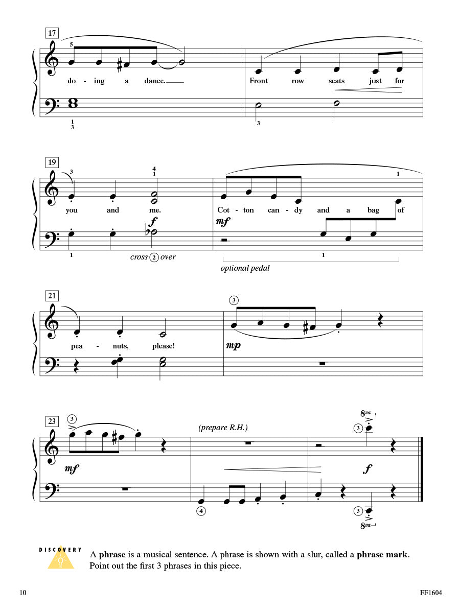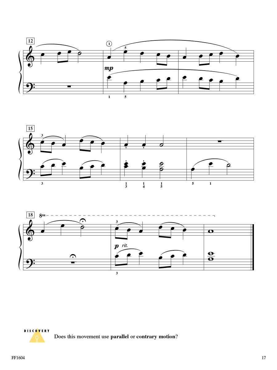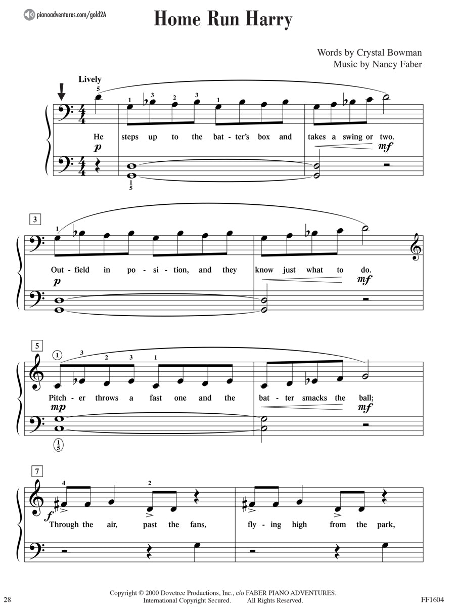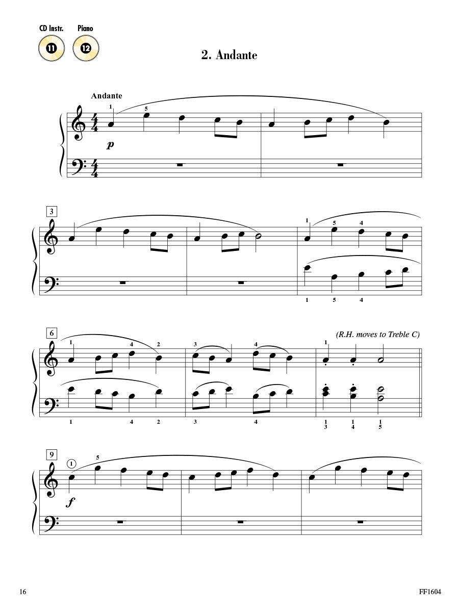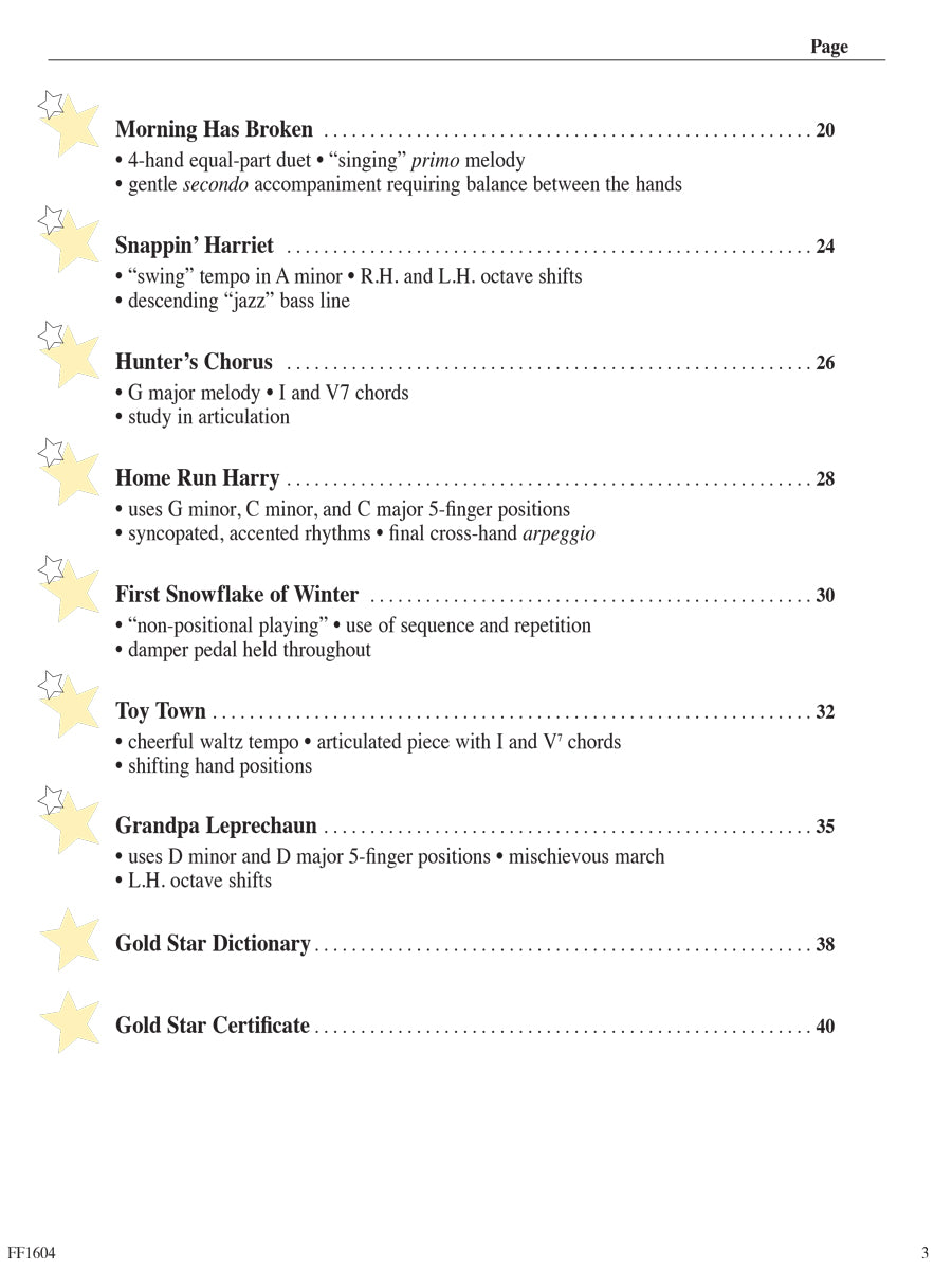 Features new piano solos for the mid-elementary pianist from Nancy and Randall Faber, some with optional teacher duet parts. These pieces present a broad range of styles to enhance the young musician's awareness of classical, jazz, folk, and impressionistic sounds. Repeated listening and play-along with the online audio accompaniments will familiarize students with diverse musical textures and sonorities, including a piano sonatina with orchestra. Contains songs and pieces like: I Love the Mountains • Little Ghost's Recital • Snappin' Harriet • and Grandpa Leprechaun.