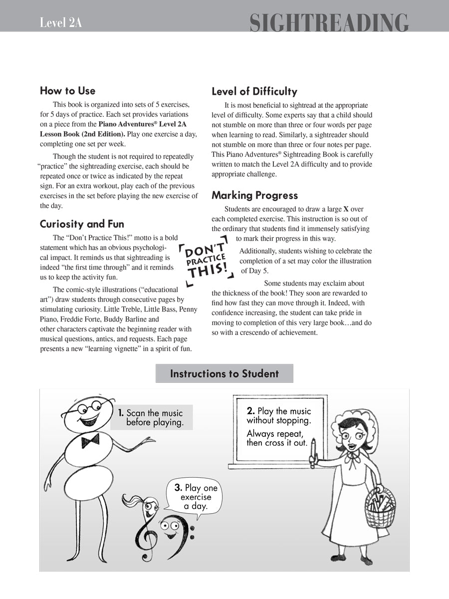 This innovative sightreading book for Level 2A builds confident readers through recognition of individual notes and perception of note patterns, both rhythmic and melodic. Entertaining musical art and rhythm road exercises motivate and guide student progress.