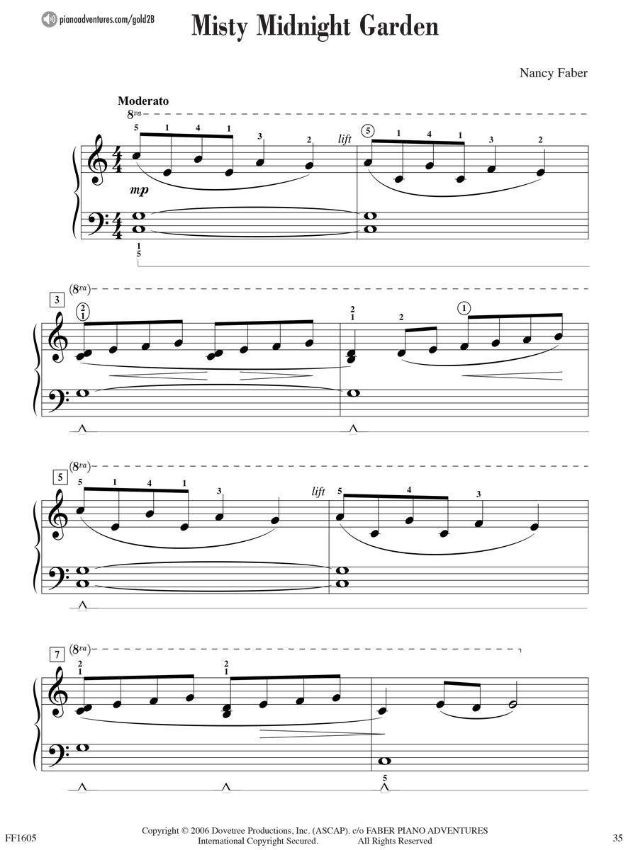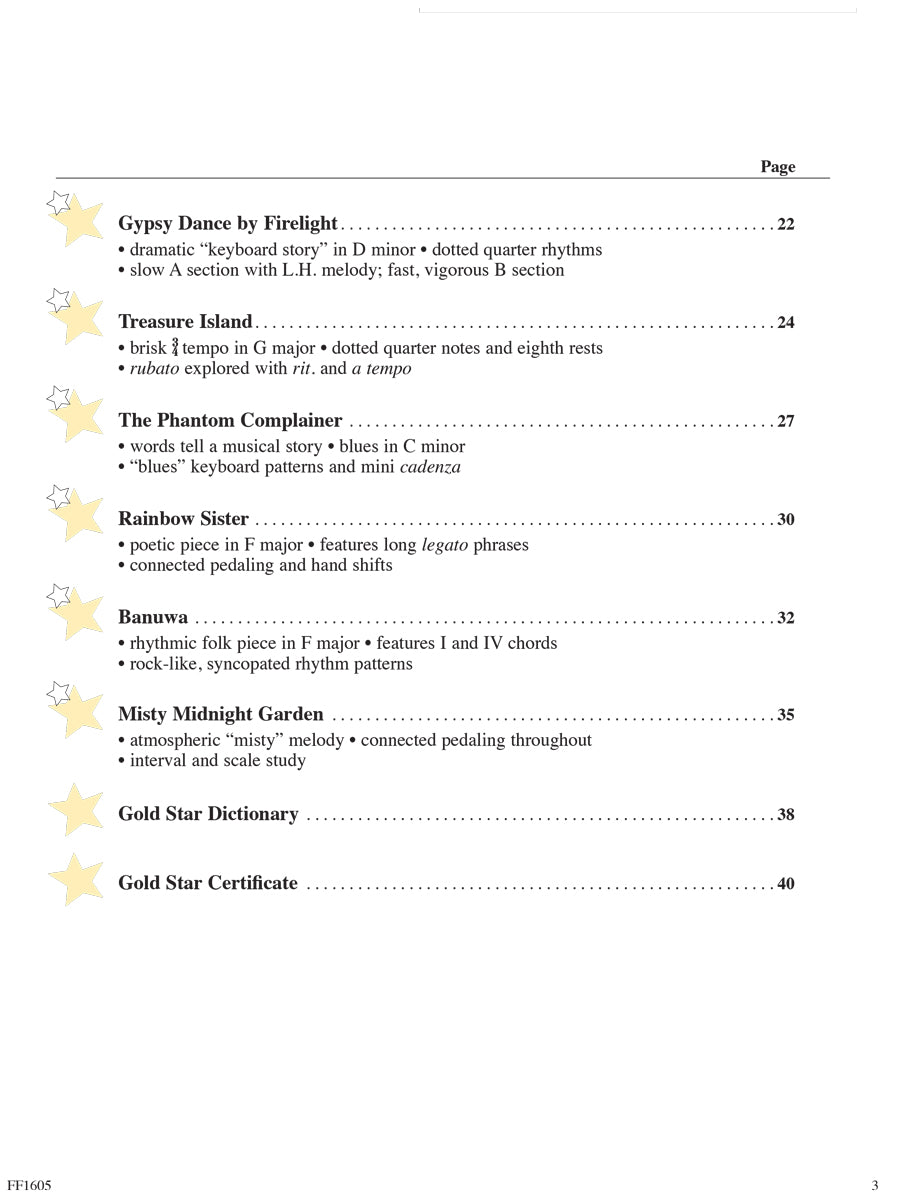 An adventurous collection for the late-elementary student that offers performance pieces “with a challenge.” These are especially appropriate for recitals and other musical events, featuring an ancient Chinese folk song, a gypsy dance by fire light, and a humorous blues piece. These new solos by the Fabers provide settings in harmony, style, and rhythm that explore the expressive and dramatic qualities of the piano. Titles include Festive Sonatina • Tijuana Tambourine • Treasure Island • and The Phantom Complainer. Includes online access to Gold Star Performance audio for both listening and play-along.
