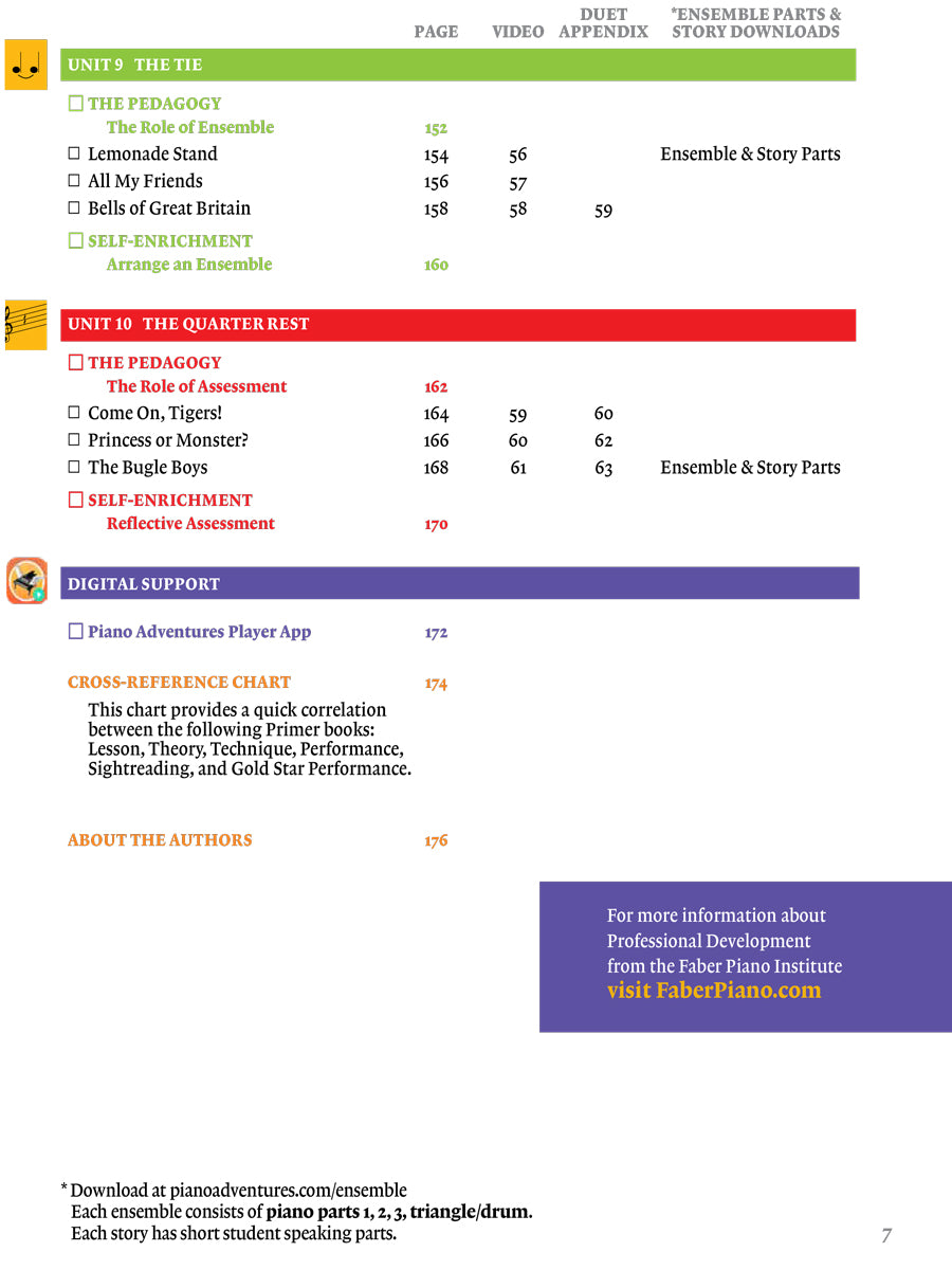 The 2nd Edition Primer Level Teacher Guide provides comprehensive support for instructing beginning students using the Fabers’ student-centered curriculum. Included are updated lesson plans, tips for reinforcing concepts and skills, and ideas for creative music exploration. Watch Nancy Faber and her young students in over 60 model teaching videos. Review and reflect with 20 new pedagogy articles and “ask yourself” study questions. And prepare for group activities with new ensemble parts, stories, and extended teacher duets. Get inspired to Analyze, Create, and Express with your Primer students! This print edition includes the 176-page hardcover Teacher Guide, 64-page softcover Duet Appendix, and a DVD featuring over three hours of video lessons. Download a sample Ensemble & Story. Online edition also available: