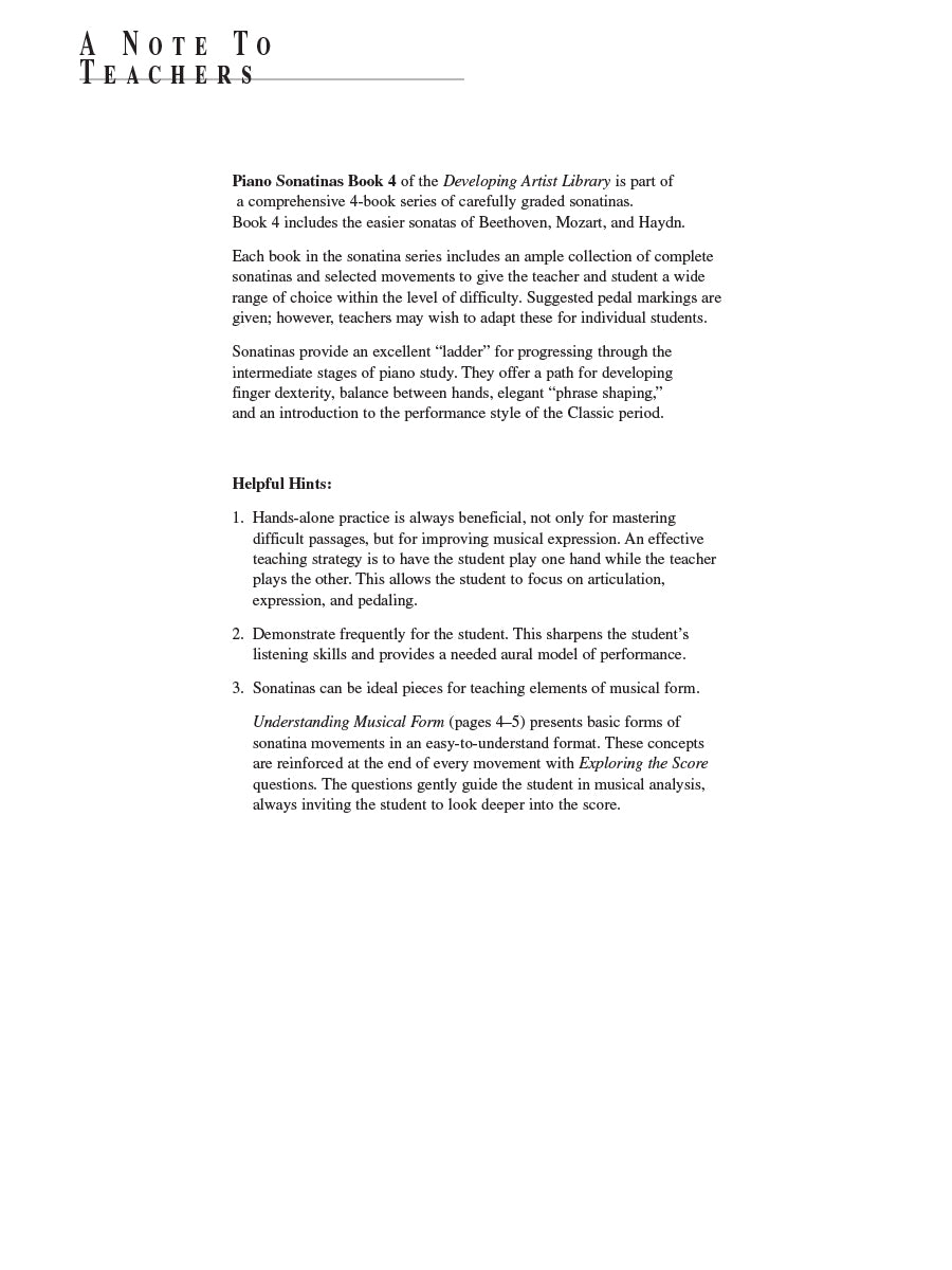 Includes the easier sonatas of Beethoven, Mozart, and Haydn. Contents include: Sonatina Op. 36, Nos. 4 & 6 (Clementi) • Sonatina Op. 54 No. 1 (Gurlitt) • Sonatina (Keller) • Sonatina Op. 88 Nos. 1 & 3 (Kuhlau) • Sonata Op. 49, No. 2 (Beethoven) • Sonata Hob. XVI/13 3rd mvt (Haydn) • Sonata K545 (Mozart) • Rondo a la Turk (from Sonata in a Major, K331) (Mozart) • and more.