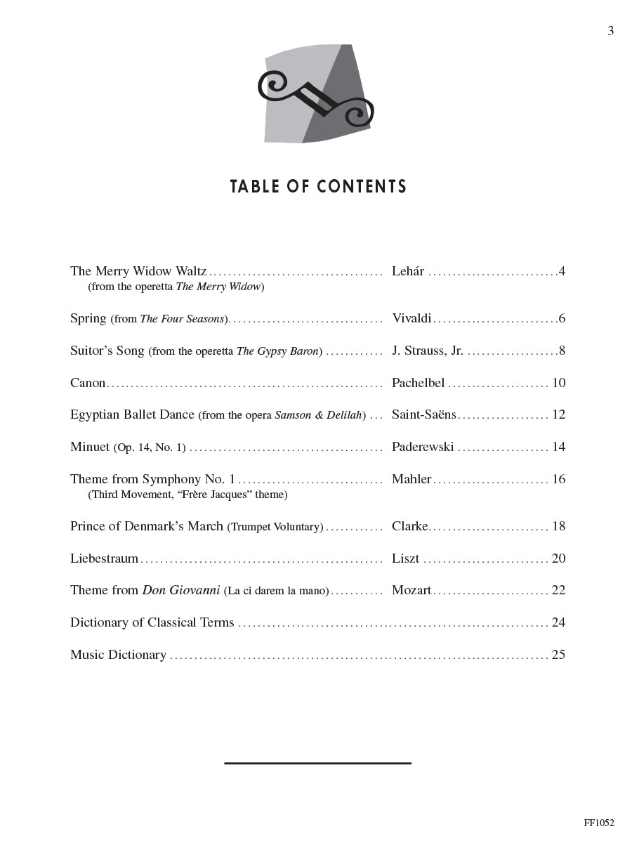 An excellent collection of symphonic and operatic works by the great composers. The pieces were chosen for their appealing melodies and rhythmic vitality. Includes: Theme from Don Giovanni (La ci darem la mano) by Mozart • Egyptian Ballet Dance (from the opera Sanson & Delilah) by Saint Saëns • Liebestraum by Liszt • The Merry Widow Waltz (from the opera The Merry Widow) by Lehár • Minuet (Op. 14, No. 1) by Paderewski • Canon by Pachelbel • Spring (from The Four Seasons) by Vivaldi • Suitor's Song (from the operetta The Gypsy Baron) by J. Strauss, Jr. • Theme from Symphony No. 1 (Third Movement, “Frère Jacques” theme) by Mahler • Prince of Denmark's March (Trumpet Voluntary) by Clarke.